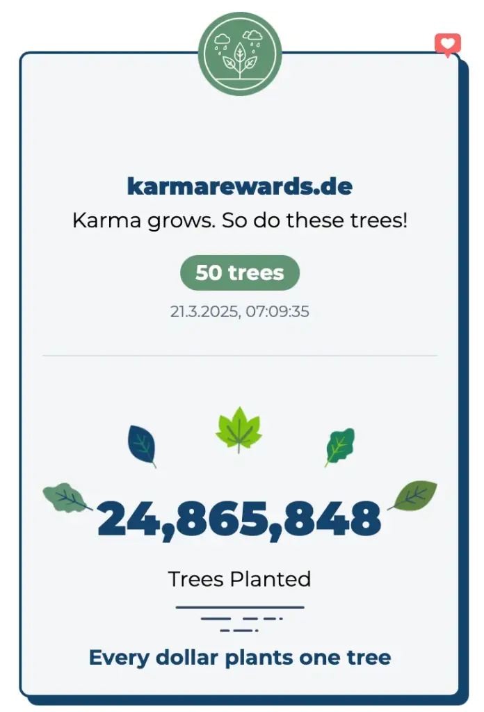 Wir bei karmarewards.de und shop4karma.de haben uns deshalb entschieden, das weltweite Projekt #TeamTrees von Mr. Beast zu unterstützen. Für jeden Einkauf über unsere Seiten fließt ein Teil in echte, greifbare Wiederaufforstung. So wird jeder Klick auf “Kaufen“ zu einem kleinen “Danke” an die Erde.